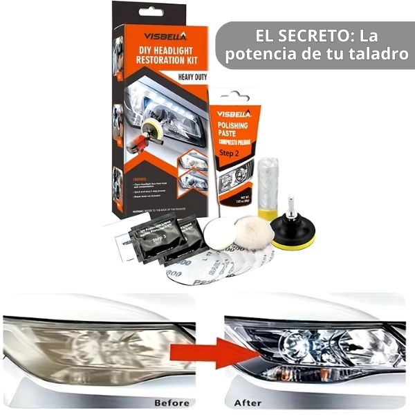 No necesitas herramientas extrañas. Incluye todas las lijas, pastas, adaptadores y cintas necesarias para ambos focos.